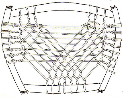 | The start of weaving the toe of a 'square-toe' snowshoe. The weaving pattern is essentially the same in all parts of the snowshoe, but is modified to fit different configurations of space ; here it is modified to fill the wider square-toe section of the frame [ as compared to the more triangular tail section].From ''Making the Attikamek Snowshoe'', sketch Henri Vaillancourt | An exceptionally finely woven snowshoe, circa pre-1926, McCord Museum collection, Montreal. The pattern is unusually complex, but might be typical of snowshoes made in earlier times: from ''Making the Attikamek Snowshoe'', photo Henri Vaillancourt |