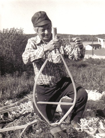 Moise Flamand pulling a square-toe snowshoe frame into shape; Manouane, Quebec 1979; from ''Making the Attikamek Snowshoe '', photo Henri Vaillancourt |